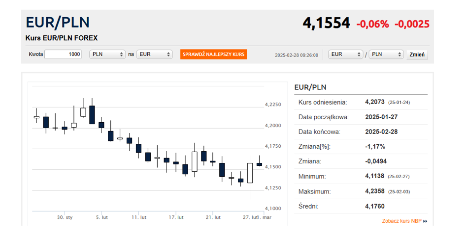 Niespełna trzy godziny później kurs EUR/PLN był już ponad 3 grosze wyżej, a do czwartkowego wieczoru wzrósł do blisko 4,167 zł, co jednak wiązało się z wpisami prezydenta USA Donalda Trumpa, że zawieszone cła na import z Meksyku i Kanady zaczną obowiązywać 4 marca oraz że nałoży dodatkową taryfę 10 proc. na produkty z Chin. Umocnił się dolar do euro, co miało swoje konsekwencje także dla złotego.