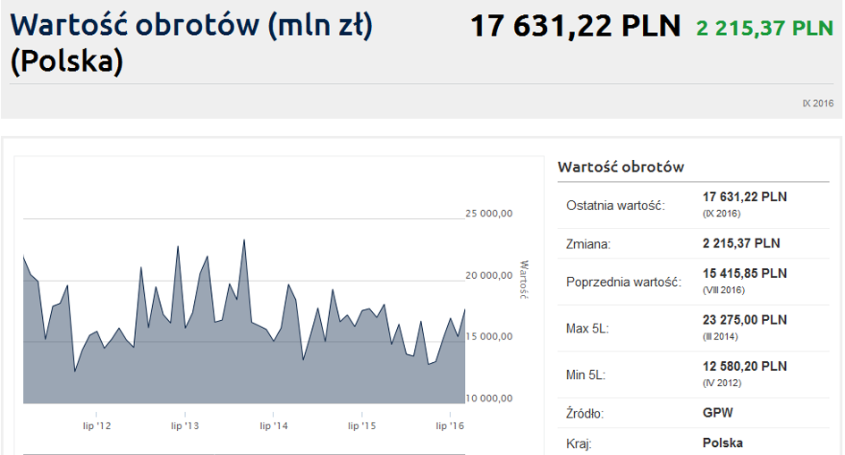 Liczba transakcji we wrześniu 2016 r. wyniosła 1,5 mln (spadek o 0,5% r/r). Średnia dzienna wartość obrotu akcjami w ramach arkusza zleceń na głównym rynku wyniosła 749,73 mln zł.