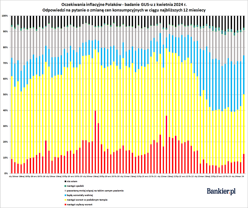 W kwietniowym badaniu mocno wzrósł odsetek respondentów oczekujących szybszego wzrostu cen w następnych 12 miesiącach. Wyniósł on 12,42% wobec 7,12% w marcu i był najwyższy od 15 miesięcy. Ubyło też wierzących w to, że ceny będą rosły wolniej niż dotychczas. W rezultacie blisko 75% ankietowanych stoi na stanowisku, że w kolejnych 12 miesiącach nastąpi wzrost cen. Jeszcze na początku roku odsetek ten nie przekraczał 70%. To jednak wciąż mniej niż między jesienią ’21 a wiosną ’23, gdy ponad 80% respondentów spodziewało się wzrostu cen.
