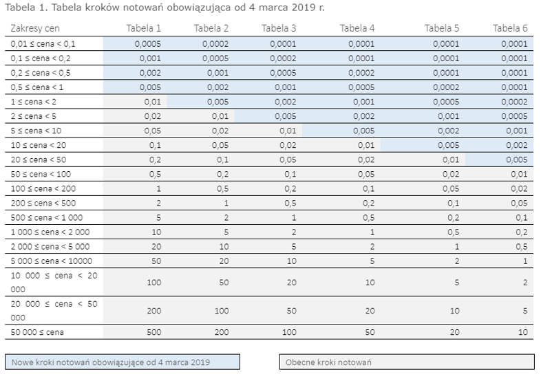 Obecnie (do 4 marca 2019 r.) kroki notowania dla większości akcji oraz funduszy typu ETF wahają się (w zależności od instrumentu) od jednego do kilku groszy. W wyniku planowanej zmiany zostanie wprowadzonych sześć nowych kroków notowań mniejszych niż jeden grosz, które wyniosą odpowiednio: 0,0001 zł; 0,0002 zł; 0,0005 zł; 0,0010 zł; 0,0020 zł; 0,0050 zł.