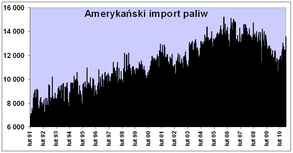 Jednakże wysoki stan zapasów to tylko jedna strona medalu. Bowiem amerykański rafinerie pracują pełną parą – wykorzystanie mocy produkcyjnych od trzech tygodni przekracza 90%. W minionym tygodniu w USA produkowano średnio 9.648 baryłek benzyny dziennie, czyli najwięcej w dziejach amerykańskiego przemysłu naftowego. Warto podkreślić, że produkcja ta nie zalega w magazynach, ponieważ zapasy gotowej benzyny od marca utrzymują się na stosunkowo stabilnym poziomie. Skutkiem rekordowej produkcji jest rosnący import ropy do USA. W zeszłym tygodniu Amerykanie sprowadzali przeciętnie 11,15 mln baryłek dziennie, czyli aż o 11,8% więcej niż tydzień wcześniej. To najwyższy wynik od czterech lat i jeden z najwyższych w historii.
