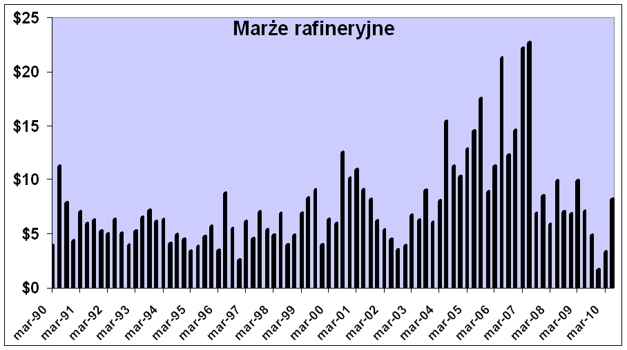 Rosnąca produkcja w amerykańskich rafineriach nie bierze się znikąd. W trakcie ostatnich czterech miesięcy marże rafineryjne w Stanach Zjednoczonych osiągnęły najwyższy poziom od zimy ubiegłego roku. Rafineriom po prostu opłaca się kupować jak najwięcej ropy i produkować jak najwięcej benzyny i pozostałych destylatów. Przeciętna cena detaliczna galona benzyny w USA od dwóch miesięcy utrzymuje się na poziomie ok. 2,75$ (czyli ok. 2,21 zł za litr) i waha się od 2,59$ na wybrzeżu Zatoki Meksykańskiej do 3,13$ w Kalifornii. Rok temu przeciętna cena paliwa wynosiła 2,50$, a w połowie lipca ’08 osiągnęła rekordowy poziom 4,11$ za galon. W relacji rocznej (lipiec do lipca) cena detaliczna benzyny wzrosła mocniej niż notowania ropy naftowej.