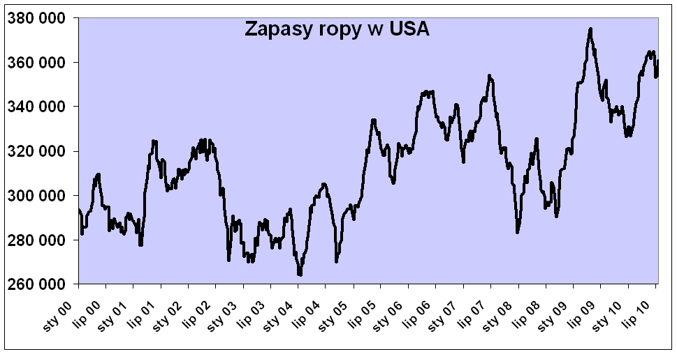 Najnowszy raport Departamentu Energii znów zaskoczył analityków. Zapasy surowej ropy wzrosły aż o 7,3 mln baryłek, czyli 4,6-krotnie mocniej od prognoz. Stan rezerw komercyjnych sięgnął 360,8 mln baryłek i jest o 3,7% wyższy niż przed rokiem, gdy amerykańska gospodarka zaczynała podnosić się po najcięższej recesji od trzech dekad. Zapasy destylatów (czyli głównie oleju napędowego) zwiększyły się o 1,15 mln baryłek, osiągając najwyższy stan od października, gdy niemal wyrównały rekord z początku lat 80-tych.