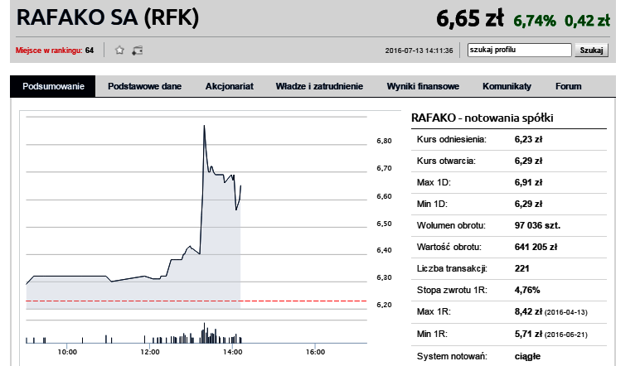 Na informację o kontrakcie zareagował giełdowy kurs spółki. Tuż po 14 za akcje Rafako płacono 6,65 zł, o 6,74% więcej niż podczas wtorkowego zamknięcia. Spółka odbija tym samym od rocznych minimów.