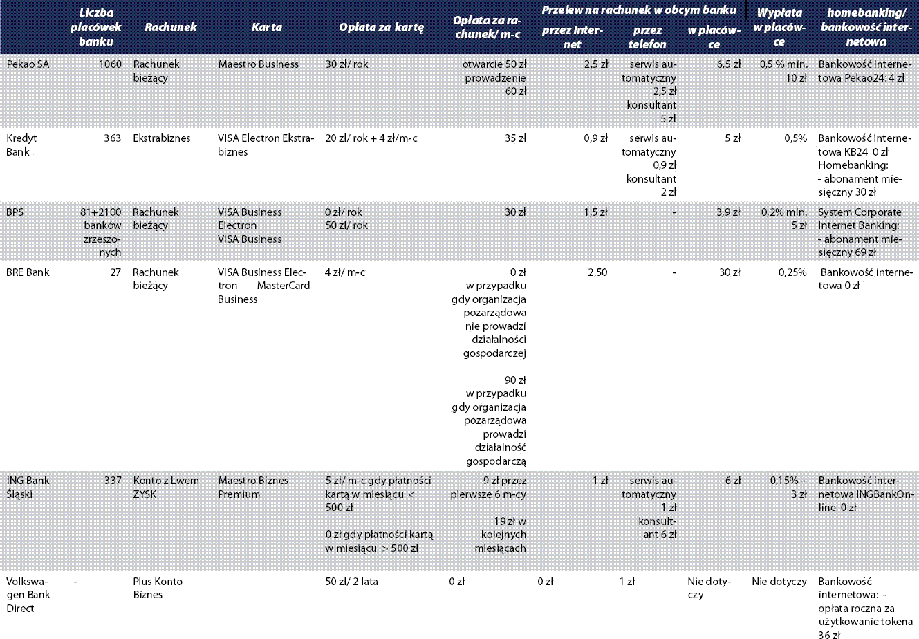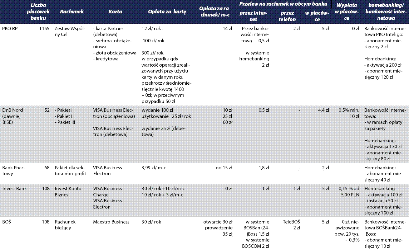 Z przeprowadzonego badania wynika, że zdecydowana większość banków nie posiada w swojej ofercie konkretnych rozwiązań dla organizacji non-profit. Dla większości banków jest to zbyt mały i zbyt mało dochodowy segment klientów, by opłacalne było tworzenie specjalnej oferty. Należy jednak podkreślić, że organizacje z III sektora mają możliwość korzystania ze standardowych usług dedykowanych małym i średnim przedsiębiorstwom. W niektórych przypadkach banki udzielają organizacjom pozarządowym odstępstw od podstawowych stawek opłat i prowizji oraz umożliwiają wynegocjowanie łagodniejszych warunków.