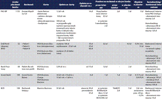 - Pakiet za 60 PLN miesięcznie - obejmuje otwarcie i prowadzenie rachunku oraz następujące usługi: udzielanie informacji o koncie przez telefon, wpłaty gotówkowe na rachunek, wypłaty gotówkowe z rachunku w cenie 75% opłaty określonej w taryfie prowizji i opłat, przelewy krajowe i zagraniczne na rachunki bankowe w cenie równej 75% opłaty określonej w taryfie prowizji i opłat, składanie i realizację zleceń stałych, wydanie dwóch kart VISA BUSINESS (po spełnieniu warunków otrzymania karty płatniczej) w cenie równiej 75% opłaty określonej w taryfie prowizji i opłat.