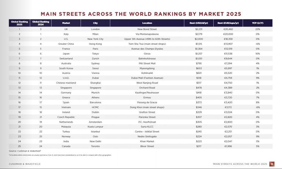 Za sprawą 22-procentowej podwyżki czynszów, najdroższą ulicą świata w III kw. 2025 r. okazała się londyńska New Bond Street, która wyprzedziła znajdującą się w Mediolanie Via Montenapoleone. To jedyne dwie ulice na świecie, w przypadku których zanotowano przeciętne roczne czynsze opiewające na co najmniej 20 tys. euro za metr kwadratowy.