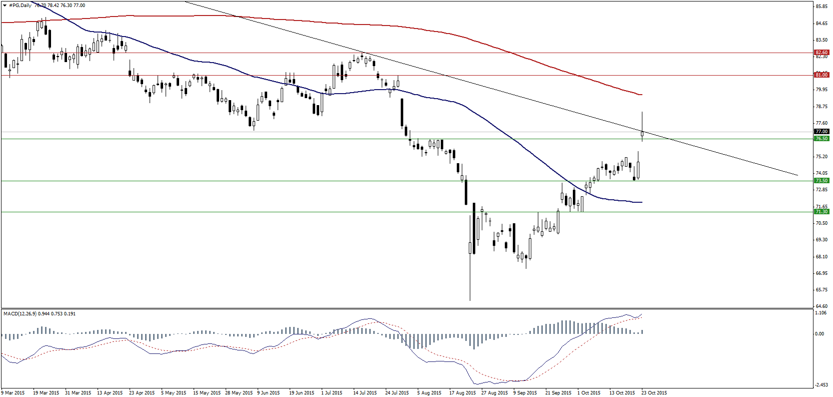 Nieco lepsze od prognoz zyski kwartalne Procter & Gamble (zysk na akcję wyniósł 0,98 USD) podbiły notowania spółki. Inwestorom nie przeszkadzał fakt, że przychody okazały się o 640 milionów niższe od konsensusu rynkowego, co oznacza spadek w stosunku do analogicznego okresu roku poprzedniego o prawie 12%. Podczas piątkowego otwarcia akcje P&G zyskały 1,85 dolara. W trakcie sesji byki starały się kontynuować wzrosty, jednak dzień został zamknięty tylko 30 centów ponad poziomem otwarcia. Kupującym nie udało się utrzymać ponad linią 10-miesięcznego trendu spadkowego. Niemniej jednak notowania znalazły się powyżej oporu sierpniowej konsolidacji, czyli poziomu 76,5 dolara, a MACD znów wskazuje na północ. To daje nadzieje na kolejną próbę wybicia ponad trend i na atak na 200-okresową średnią.