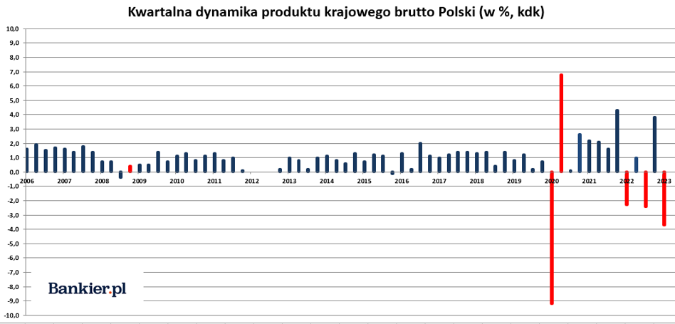 Główny Urząd Statystyczny we wstępnym szacunku wskazał, że polska gospodarka w II kwartale 2023 r. skurczyła się w porównaniu do analogicznego okresu roku poprzedniego i do pierwszego kwartału bieżącego roku. W tym drugim przypadku był to najgorszy wynik od czasów covidowych, a dwa kwartały z rzędu spadku dynamiki to swoją drogą tzw. techniczna recesja.