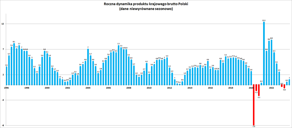 W III kwartale PKB Polski wzrósł o 1,1% kdk i wyszedł na plus w ujęciu rocznym (+0,5% rdr). Kwartał wcześniej nasza gospodarka skurczyła się o 0,6 proc. rdr. W I kwartale 2023 r. polski PKB zaliczył spadek o 0,3 proc rdr. W 2022 roku roczna dynamika wzrostu hamowała z 8,6 proc. w I kwartale do 6,1 (po rewizji) proc. w II kwartale i 3,9 proc. w III kwartale. W ostatnim kwartale ubiegłego roku było to już tylko (po rewizji) 2,3 proc. W 2022 r. polska gospodarka urosła realnie o 4,9 proc., a nominalny produkt krajowy brutto po raz pierwszy przekroczył 3 biliony złotych.