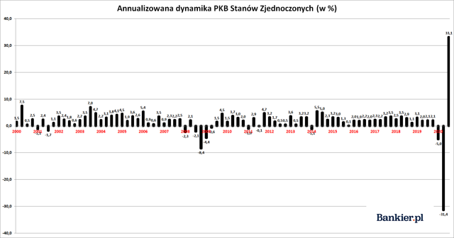 Warto jednak te dane umieścić w szerszym kontekście. W poprzednim kwartale gospodarka USA doświadczyła rekordowego spadku PKB aż o 31,4% w ujęciu annualizowanym. Ujęcie to mówi o tym, w jakim tempie rozwijałaby się tamtejsza gospodarka, gdyby tempo wzrostu w kwartale, w którym dokonano pomiaru, utrzymało się na takim samym poziomie przez cały rok.