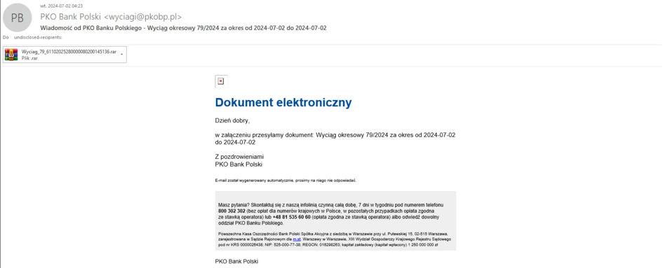 Oszuści podszywają się pod PKO Bank Polski. Przestępcy wysyłają wiadomości e-mail z załącznikiem, który ma rzekomo zawierać wyciąg okresowy transakcji za wskazany okres. W rzeczywistości plik zawiera złośliwe oprogramowanie. Za jego pomocą oszuści mogą poznać nasze dane, takie jak hasła bankowości internetowej.