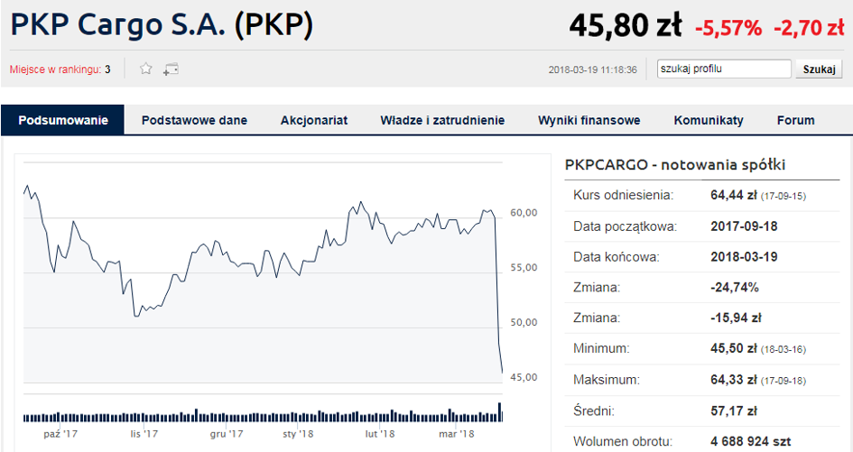 W piątek PKP Cargo podało wyniki za 2017 r. Spółka odbiła się w końcu od dna i pokazała najwyższe zyski od 2012 r. Zupełnie inaczej odebrali to jednak akcjonariusze, którzy liczyli na znacznie więcej. Kurs spółki tuż po wynikach wręcz runął, dziś mamy natomiast kontynuację tych spadków.