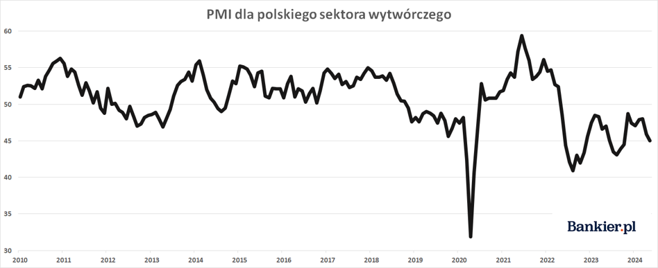 Majowy spadek polskiego PMI nastąpił po nieoczekiwanym i mocnym pogorszeniu koniunktury w kwietniu. Z kolei wynik za marzec był najwyższy od czterech miesięcy i dawał nadzieje na zakończenie przemysłowej recesji już w II kwartale 2024 r. Teraz oczekiwania te okazały się płonne.