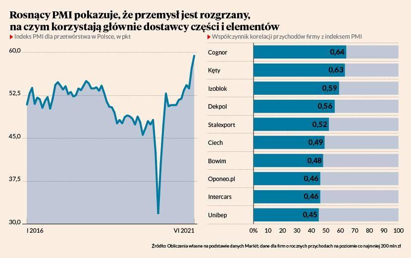 W tym miesiącu pokazuję, dla których firm w Polsce te wskaźniki powinny być szczególnie ciekawe. Na wykresie widać korelację między przychodami poszczególnych firm a indeksem PMI. Wyróżniłem 10 spółek o największej korelacji. Wniosek? Największą wrażliwość na zmiany tego indeksu mają przychodu producentów i dystrybutorów metali (Kęty, Cognor — producenci, Bowim — dystrybutor) czy części dla motoryzacji (Izoblok — producent, InterCars i Oponeo.pl — dystrybutorzy).