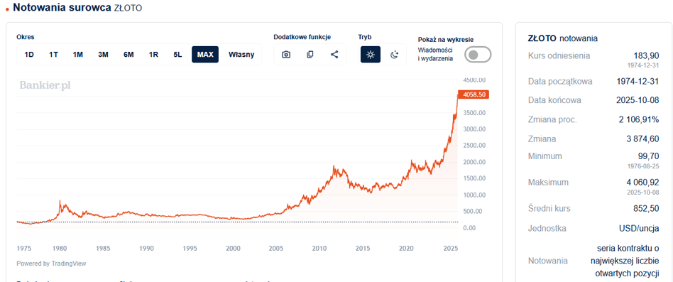 Pierwszy raz w historii zobaczyliśmy złoto po 4 000 USD/oz. Tak gwałtowna aprecjacja królewskiego metalu sugeruje, że świat finansów coraz szybciej traci zaufanie do dolara i obligacji rządu USA. Złoto tak naprawdę wraca do systemu jako jedyny pewny pieniądz.