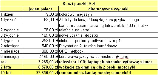 Warto jednak zwrócić uwagę, że finansowe korzyści z rzucenia nałogu można odnieść już w perspektywie kilku, czy kilkunastu dni. Po tygodniowej abstynencji nikotynowej w kieszeni palacza zostaje 63 zł. Z pozoru niewiele, ale jest to równowartość dwóch biletów do kina, dwóch książek lub przeciętnego abonamentu telefonicznego. Natomiast już po dwóch tygodniach kwota starczy na karnet na basen, siłownię czy do klubu fitness. Rocznie palacz puszcza z dymem równowartość nowego laptopa, markowej lustrzanki cyfrowej, czy telewizora LCD.