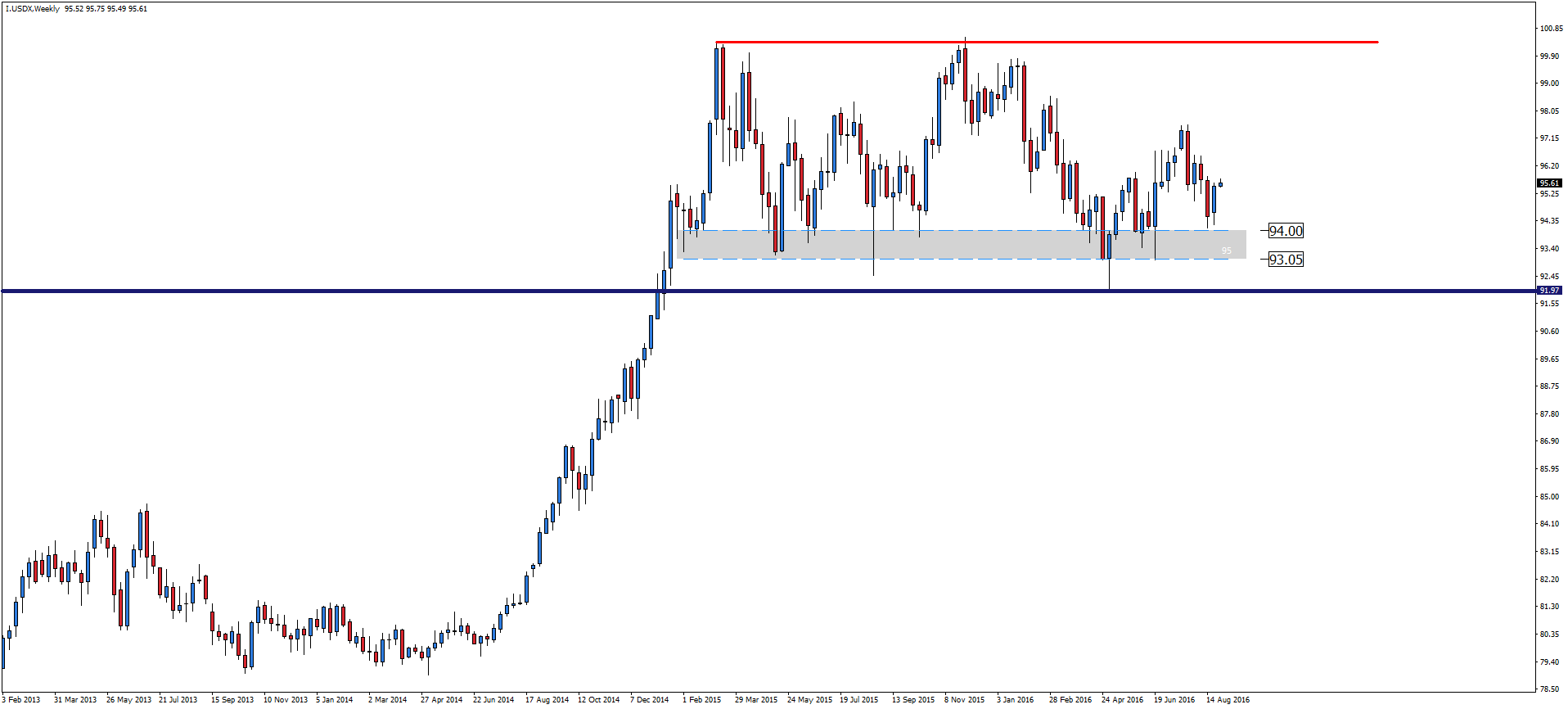 Spoglądając na tygodniowy wykres dolar indeksu nie powinniśmy oczekiwać szybkiego rozstrzygnięcia sprawy. Od kilka tygodni byki walczą o utrzymanie poziomu wsparcia 93.05-94.00. Na dzień dzisiejszy z powodzeniem, jednak kontynuacja ostatnich wzrostów w okolicę poziomu 100 jest bardzo mało prawdopodobna. Zatem bazowym scenariuszem pozostanie dalsza konsolidacja notowań w okolicy strefy popytu.