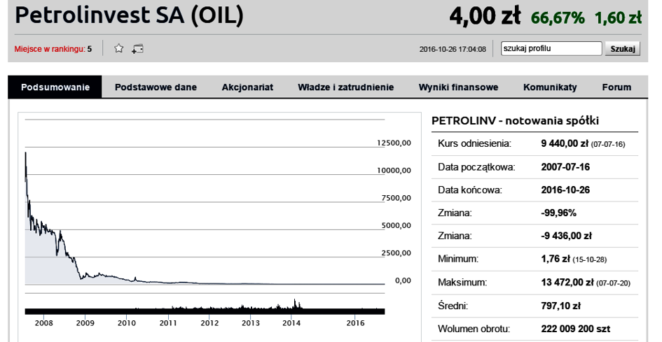 Z drugiej jednak strony "Petrol" zawsze budził emocje. Przy Książęcej zadebiutował przy blasku fleszy niemal dekadę temu, miał być spełnieniem naftowego snu Ryszarda Krauzego. Akcje początkowo dały zarobić krocie, trend jednak szybko się odwrócił. Ostatecznie petrodolary z Kazachstanu nie popłynęły do kas spółki, a jej kurs zaczął się stopniowo staczać, zamieniając wspomniany sen w giełdowy koszmar. Spadkom towarzyszyły jednak pojedyncze wystrzały, które stworzyły z Petrolinvestu swego rodzaju raj dla spekulantów.