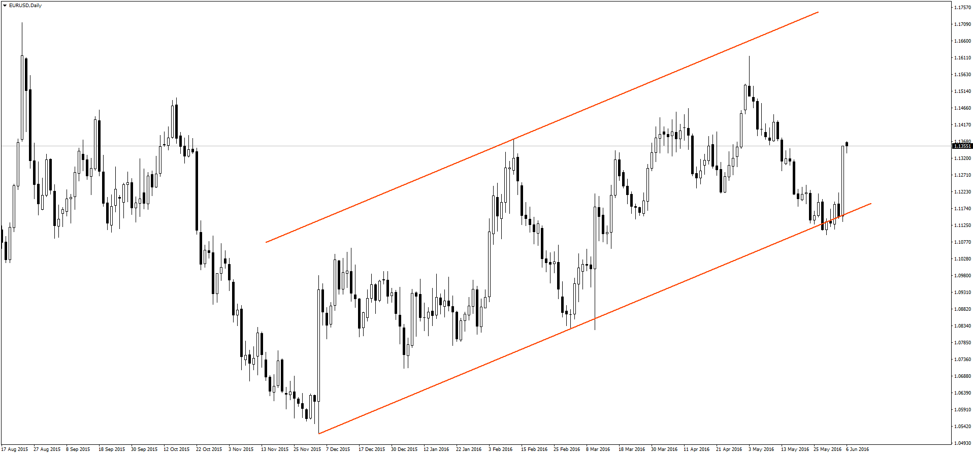 Reakcja rynku po tak słabych danych makroekonomicznych była natychmiastowa. Kurs walutowy EUR/USD po wstępnym przebiciu dolnego ograniczenia kanału spadkowego z impetem powrócił do kanału wzrostowego. Należy pamiętać o dzisiejszym przemówieniu Janet Yellen, które może znacząco wpłynąć na szeroki rynek dolara amerykańskiego.