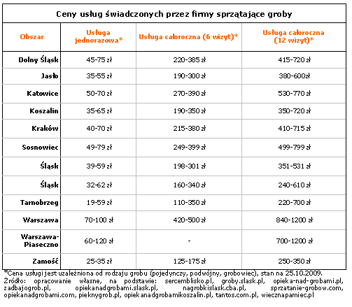 Najgrubszymi portfelami muszą dysponować klienci firm świadczących takie usługi w stolicy. Rzadko zdarza się specjalna oferta na święta, podane w zestawieniu ceny obowiązują w ciągu całego roku, bowiem grobowy biznes kwitnie nie tylko na przełomie października i listopada.