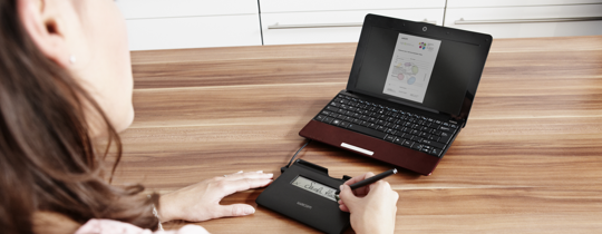 Urządzenie sign&save firmy Wacom jest pierwszym narzędziem do elektronicznych podpisów skierowanym do małych i średnich przedsiębiorstw, które pragną zarządzać swoimi dokumentami bardziej efektywnie. sign&save to łatwe w obsłudze urządzenie typu plug & play (umożliwiające pracę z komputera z tabletem zaraz po jego podłączeniu), składające się z tabletu do podpisów Wacom STU oraz specjalnie w tym celu stworzonego oprogramowania Wacom sign I pro PDF.