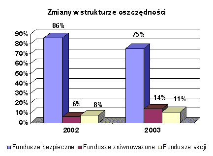 Decyzje klientów znalazły odwzorowanie w strukturze funduszy. W porównaniu z 2002 rokiem nastąpiło wyraźne przesunięcie oszczędności do funduszy zrównoważonych i akcyjnych, przy jednoczesnych zachowaniu wysokiego poziomu zaangażowania w instrumenty o najmniejszym ryzyku inwestycyjnym.