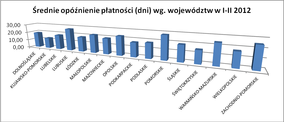 Tym można by więc tłumaczyć widoczną, zwłaszcza w województwach północno-zachodniej Polski tendencję do większego opóźniania płatności. W województwach tych wynosi ono przeciętnie od 28 dni (pomorskie), przez 27 dni (lubuskie) do 25 dni po terminie (zachodniopomorskie). W województwach tych oferowane jest klientom jednocześnie najkrótsze odroczenie płatności. (kredyt kupiecki na wspomniane 45-49 dni). Oprócz województw opolskiego i warmińsko-mazurskiego (23 dni opóźnienia) średnie terminy przeterminowania zapłaty są zazwyczaj krótsze i wynoszą niewiele ponad dwa tygodnie po terminie (15-18 dni), ale jednocześnie oferowany kredyt jest dłuższy (55 do 62 dni).