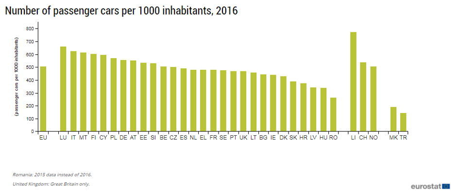Instytucja opublikowała dane prezentujące stopę zmotoryzowania członków Unii Europejskiej i EFTA. W tej pierwszej grupie liderem jest Luksemburg, w którym na 1000 mieszkańców przypada 662 samochodów. Rozszerzając jednak zakres badania, na czoło zestawienia wysuwa się Lichtenstein z 773 autami.