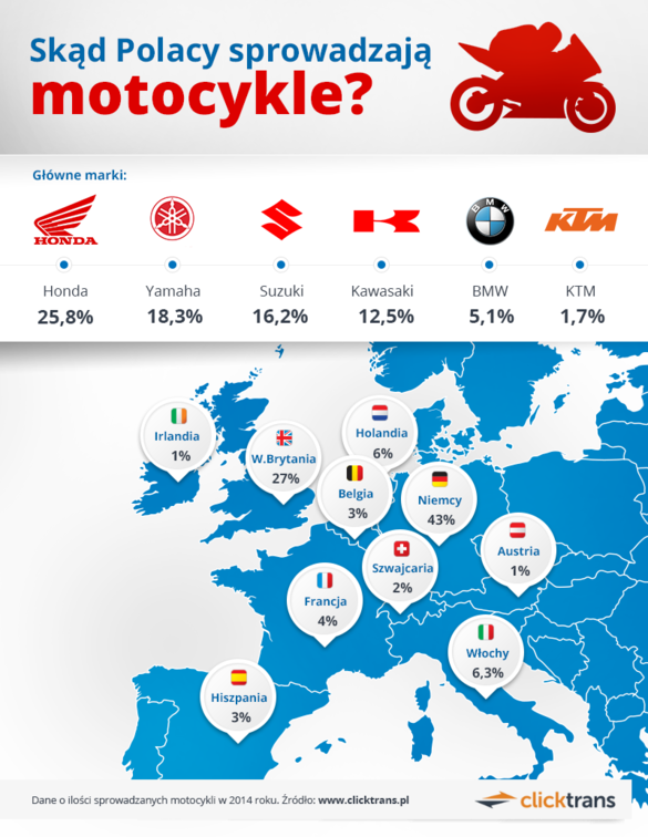 Najczęściej Polacy zlecają transport motocykli między miastami w obrębie Polski. Transport taki stanowi 60% zleceń dotyczących transportu motocykli. Wśród krajów, z których Polacy w latach 2011-2015 najchętniej sprowadzali motocykle były głównie Niemcy (37,9%), Wielka Brytania (33,6%), Włochy (6,8%), Francja (4,7%) oraz Holandia (4,6%).