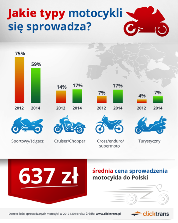 Najbardziej popularnym typem sprowadzanego motocykla jest motocykl sportowy. Na przestrzeni lat 2011-2015 ich udział wynosił aż 61% wśród wszystkich transportów motocykli zlecanych na Clicktrans.pl do Polski. Cruiser/Chopper miał udział 17% a Cross/Enduro/Supermoto 15%. Turystycznych motocykli przewoziło się tylko 5%. Wśród motocykli wywożonych z Polski za granicę udziały wyglądają podobnie z jeszcze większą przewagą motocykli sportowych nad resztą (72%).