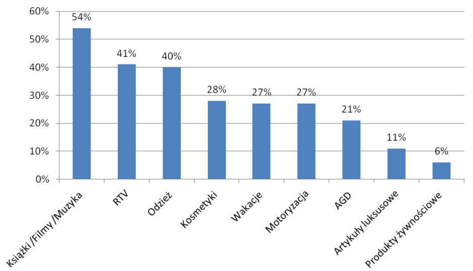 21 proc. w ciągu ostatniego roku nabyło przez Internet urządzenia wyposażenia mieszkania lub domu. Niewielu badanych przyznało, że za pośrednictwem sklepów internetowych kupuje dobra luksusowe, jak biżuteria czy zegarki, oraz artykuły żywnościowe. Było to odpowiednio 11 i 6 proc.