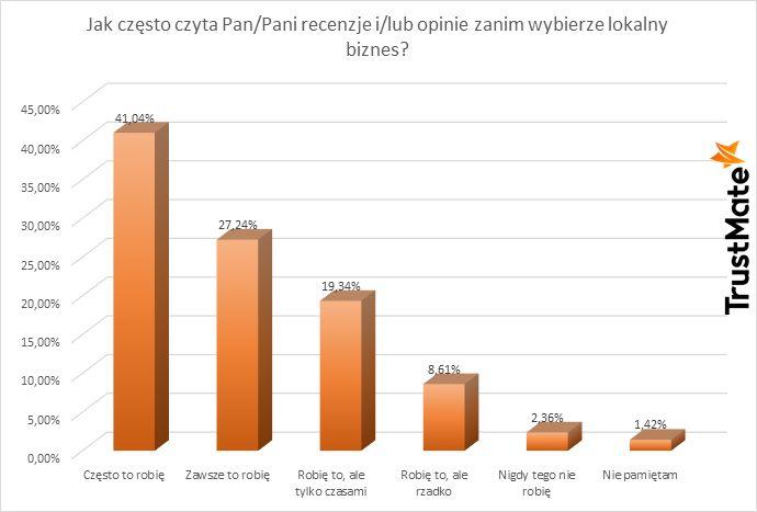 27% internautów czyta recenzje na temat firm z okolicy "zawsze", a 41% "często". Najbardziej aktywni w czytaniu opinii są mieszkańcy województwa lubuskie, pomorskie, warmińsko-mazurskie i zachodniopomorskie, a także osoby z wykształceniem podstawowym/gimnazjalnym. Z resztą, tak samo jak osoby z najniższymi dochodami, aż 37,10% z nich czyta opinie „zawsze".