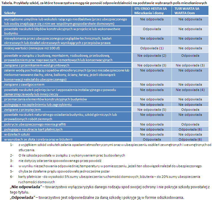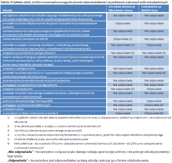 W tabeli zebrano przykłady szkód, za jakie ubezpieczyciele mogą nie brać odpowiedzialności na przykładzie dwóch wybranych polis mieszkaniowych. Jest to ujęcie ogólne, gdyż zakres ochrony może być negocjowany i za dodatkową składkę, ochrona może być rozszerzona również i o te ryzyka. Ponadto, każdy z ubezpieczycieli stosuje własne systemy określania wyłączeń odpowiedzialności. W towarzystwach możemy spotkać się z różnego rodzaju wyłączeniami, innymi niż przywołane w tabeli. Ostatecznie, o ich zakresie decydują zapisy ogólnych warunków ubezpieczeń.