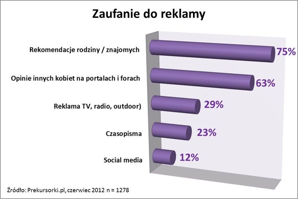 Większość Polek zauważa reklamy alkoholi w telewizji, w miejscu sprzedaży lub na portalach internetowych - wynika z raportu "Ulubione Trunki Polek". Czy ufamy reklamie, którą widzimy? Trzy czwarte Polek ufa rekomendacjom znajomych lub rodziny i 62% ufa opiniom na forach i portalach internetowych - wynika z raportu Prekursorki.pl z 2012 roku. Tylko 28% Polek ufa reklamie telewizyjnej, radiowej czy outdoor. Amerykańskie badania wskazują na kryzys zaufania do reklamy typu push.Zarówno Amerykanie, jak i Europejczycy najbardziej ufają rekomendacjom znajomych i rodziny oraz opiniom konsumentów na portalach i forach, a najmniej reklamie display, z czego zaufanie Europejczyków do każdego z tych typów reklamy jest mniejsze niż Amerykanów - wynika z raportu Forrester Research Inc. 2012r.