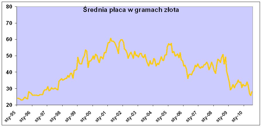 W 2009 roku zatrudnienie w sektorze przedsiębiorstw było o 1,2% niższe niż rok wcześniej, czemu towarzyszył nominalny wzrost przeciętnego wynagrodzenia o 4,4%, czyli minimalnie powyżej oficjalnego wzrostu cen detalicznych (CPI). Nie ma tu przesłanek do oczekiwania wzrostu konsumpcji. Co gorsza, pomiędzy listopadem 2008 a lutym 2009 roku siła nabywcza tzw. średniej krajowej spadła aż o 42,8%. Przed kryzysem za przeciętną płacę brutto można było kupić prawie 50 gramów złota. Zeszłej zimy było to już tylko 29 gramów, w lipcu 2010 r. zaś zaledwie 27,9 grama. Pensje nominalnie rosły, ale ich siła nabywcza malała. Kryzysowa deprecjacja złotego pogłębiła ten spadek.