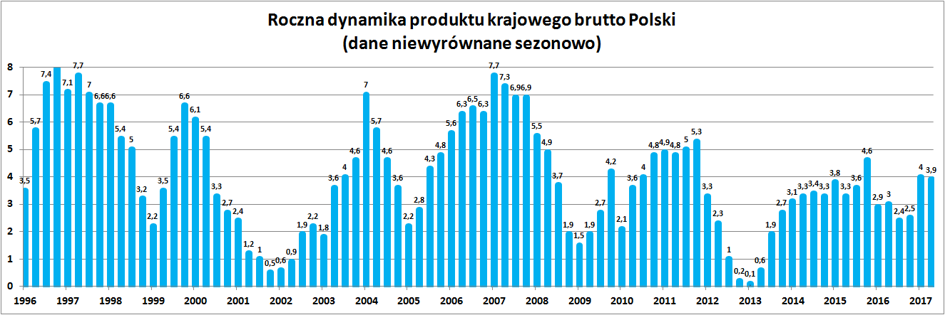 W drugim kwartale 2017 roku roczna dynamika produktu krajowego brutto w Polsce wyniosła 3,9%. Albo 4,4% - jeśli weźmiemy pod uwagę dane wyrównane sezonowo, czyli eliminujące wpływ np. różnicy w liczbie dni roboczych. PKB jest miernikiem niedoskonałym i niepozbawionym licznych mankamentów. Lecz na razie nawet dla większość krytycznie nastawionych ekonomistów PKB pozostaje podstawowym miernikiem tempa wzrostu gospodarczego kraju.