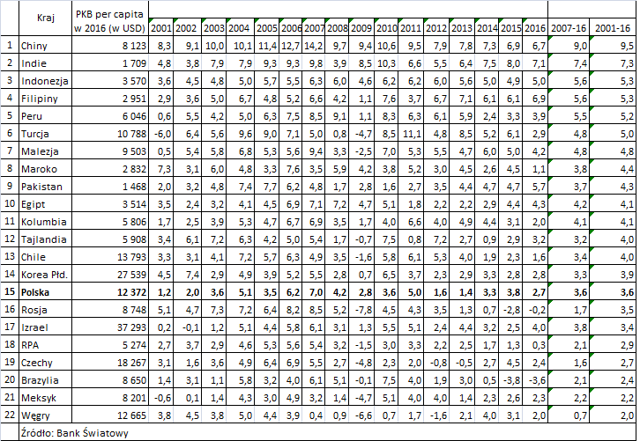 W tym zestawieniu polski sukces gospodarczy prezentuje się jeszcze mizerniej. W latach 2001-16 szybsze od nas tempo wzrostu PKB notowało 14 z 22 rynków wschodzących. Tak właściwie udało się nam wyprzedzić jedynie kraje, które na skutek błędnej polityki gospodarczej (Węgry, Brazylia) lub uzależnienia od rynku surowców (Rosja, RPA) w ostatnich latach popadły w głęboki kryzys gospodarczy. W tyle zostały także Meksyk i Czechy (choć to kraj znacznie bogatszy od Polski) oraz Izrael (który ma PKB per capita na poziomie Francji czy Japonii).