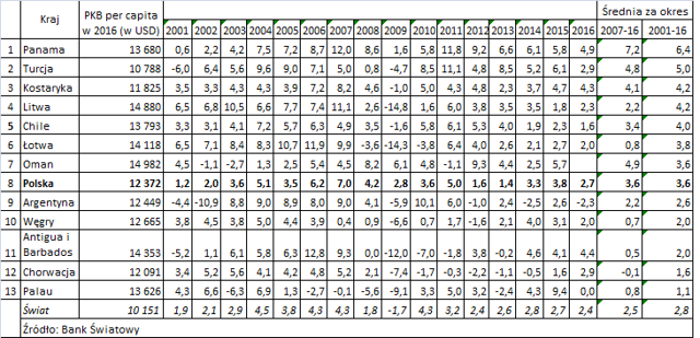 Nieco gorzej wypadamy w dłuższym horyzoncie czasowym. Perspektywa lat 2001-16 obejmuje zarówno okres dekoniunktury po pęknięciu bańki internetowej, jak i czas kredytowego szaleństwa (2003-07) oraz następującego po nim gospodarczego kaca (2008-13). W tym horyzoncie góra tabeli niewiele się zmienia (Panama, Turcja, Kostaryka). Do liderów doskakują Litwa i Chile. Nieznacznie wyprzedza nas jeszcze Łotwa (3,8%). Wypadamy za to wyraźnie lepiej od zbankrutowanej Argentyny i Węgier (które przeżyły poważny kryzys finansowy w latach 2007-12), o Chorwacji i Palau nawet nie wspominając.