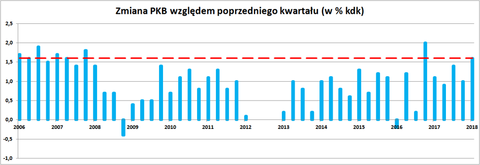 Ekonomiści dość zgodnie przewidują, że zbliżone do 5% tempo wzrostu PKB obserwowane w ostatnich kwartałach nie zostanie utrzymane w kolejnych okresach. Według Komisji Europejskiej tegoroczna dynamika PKB Polski wyniesie 4,3% i zwolni do 3,7% w roku 2019. Z kolei Europejski Bank Odbudowy i Rozwoju kilka dni temu podniósł prognozę wzrostu gospodarczego dla Polski na ten rok z 3,4% do 4,0% i zakłada spowolnienie do 3,3% w 2019 r.