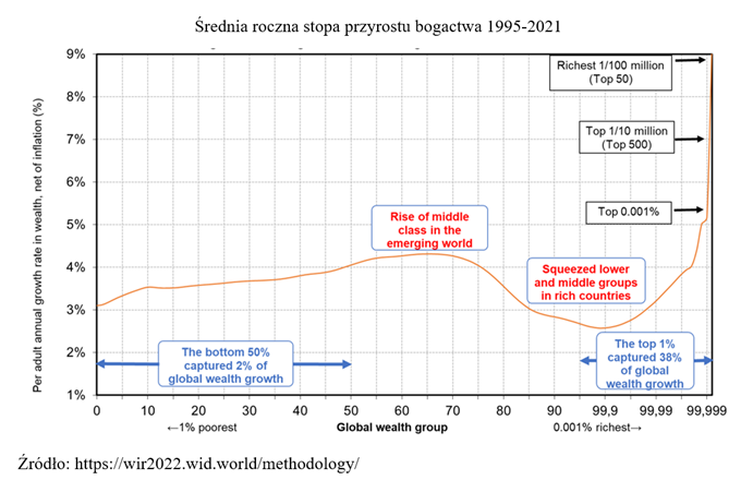 Wewnętrzne nierówności majątkowe pomiędzy najbogatszymi i najbiedniejszymi pogłębiają się. Od 1995 r. średni przyrost bogactwa najbogatszej części ludzi na świecie mieścił się w zakresie 6-9 proc. rocznie, podczas, gdy średnie bogactwo rosło o 3,2 proc w skali roku. Bogaci się bogacą i to znacznie szybciej niż reszta społeczeństwa, a pandemia COVID-19 tylko nasiliła to zjawisko.