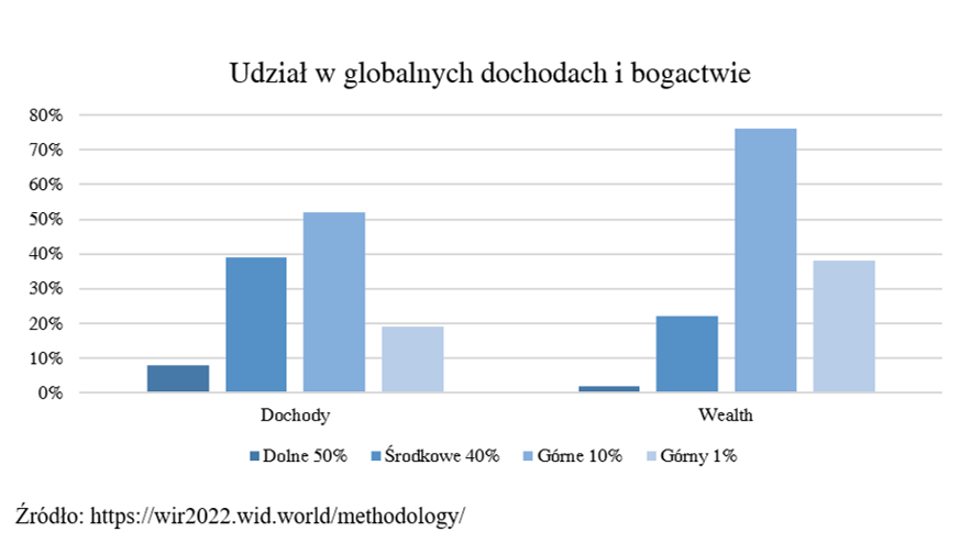 Tyle średnie. W rzeczywistości dolne 50 proc. populacji otrzymuje jedynie 8 proc. wartości globalnej dochodów, podczas gdy do 10 proc. najbogatszych trafia 52 proc. dochodów, z czego 1 proc. najbogatszych otrzymuje aż 19 proc. Takie dysproporcje mają swoje przełożenie na wielkość majątków i tak najbiedniejsza połowa świata posiada jedynie 2 proc. bogactwa światowego, 10 proc. najbogatszych zaś 76 proc., z czego 1 proc. najbogatszych posiada 38 proc. majątku światowego.