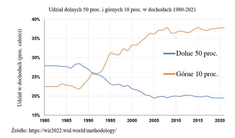 Według autorów raportu średni dochód narodowy dorosłej populacji w Polsce wynosi 26 600 euro (lub 68 950 złotych). Dolne 50 proc. zarabia 10 400 euro (26 850 złotych), mając 19,5 proc. udziału w sumie dochodów, górne 10% zarabia średnio blisko 10 razy więcej - 100 400 euro (260 260 złotych), co daje prawie 38 proc. udziału w sumie dochodów. Nierówność dochodów w Polsce jak na kraj europejski jest stosunkowo wysoka: udział górnych 10 proc. jest podobny do tego w Niemczech, ale znacznie wyższy niż w innych krajach sąsiednich.
