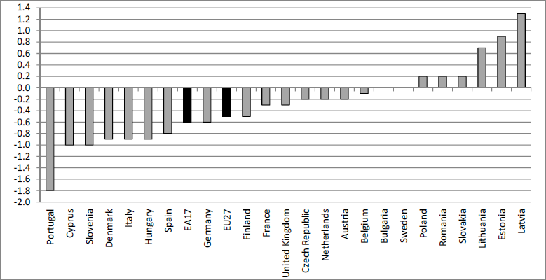 Tylko sześć krajów zanotowało wzrost PKB w ostatnim kwartale minionego roku. Wśród nich znalazła się Polska, gdzie PKB wzrósł o 0,2 proc. w ujęciu kwartalnym. Mimo że wzrost PKB sam w sobie jest pozytywnym rezultatem, to jednak jego skala w porównaniu do przewodzącej stawce Łotwy (wzrost o 1,3 proc.) jest niewielka.