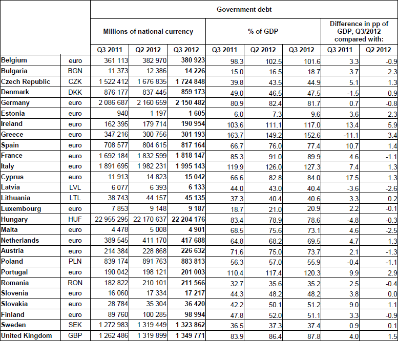 Eurostat poinformował, że dług publiczny Polski w stosunku do PKB zmalał do 55,9 proc. na koniec trzeciego kwartału 2012 roku. W drugim kwartale stosunek wynosił 57 proc., a w trzecim kwartale 2011 roku było to 56,3 proc.