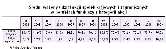 Wg ostatnich dostępnych danych (stan na 30 czerwca 2009 roku) w czołówce pod względem zaangażowania środków w akcje zagranicznych firm plasują się Lukas Akcyjny (32,1 proc.), Arka Akcji (31,3 proc.) oraz PKO Akcji (21,6 proc.) oraz PKO Akcji Plus (20,9 proc.). Nie stoi to w sprzeczności z postanowieniami statutów tych funduszy, być może jednak nie wszyscy klienci zdają sobie z tego sprawę. Części w ogóle może to nie interesować, bo godzą się z tym, że zarządzający, dążąc do maksymalizacji zysku, szukają okazji inwestycyjnych nie tylko na rodzimym rynku akcji.