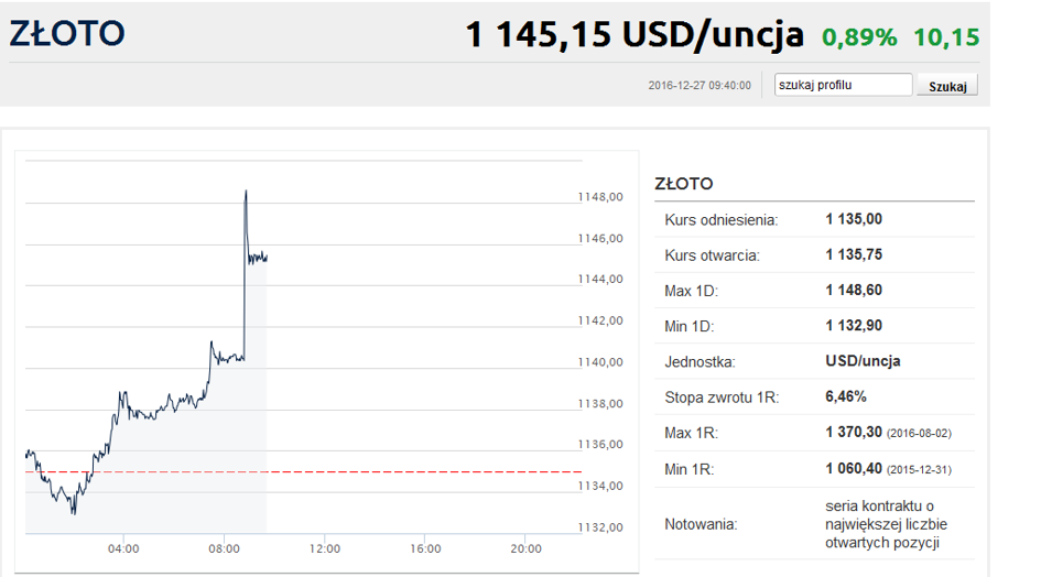 O 9:37 uncja złota na rynku terminowym kosztowała 1.143,69 dolarów.