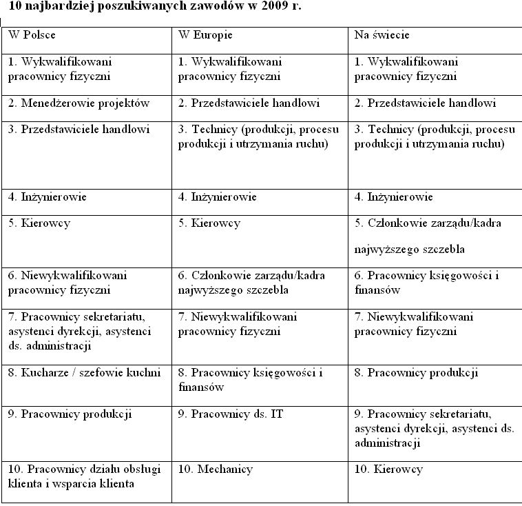 W ujęciu globalnym Manpower Inc., który jest światowym liderem w sektorze usług pośrednictwa pracy, już po raz czwarty przebadał grupę blisko 39 000 pracodawców z 33 krajów w celu ustalenia, na które stanowiska jest największe zapotrzebowanie. Najwięcej problemów ze znalezieniem odpowiednich kandydatów do pracy mają pracodawcy w Rumunii oraz na Tajwanie (62%), w Peru (56%), Japonii (55%), Australii (49%), na Kostaryce i w Polsce (48%). Najmniej problemów w obsadzaniu stanowisk pracy przez osoby właściwie do tego przygotowane mają pracodawcy w Irlandii (5%), Hiszpanii (8%), Wielkiej Brytanii (11%), Chinach (15%) i Czechach (17%). W regionie EMEA obejmującym Europę, Bliski Wschód i Afrykę, gdzie przebadano grupę ponad 15 000 pracodawców, aż 25% ma kłopoty w obsadzeniu stanowisk odpowiednio wykwalifikowanymi pracownikami. W tym względzie największe problemy zgłaszają pracodawcy z następujących krajów: Rumunii (62%), Polski (48%), Grecji (37%), Szwajcarii (36%). Najmniejsze problemy mają pracodawcy z Irlandii (5%), Hiszpanii (8%) i Wielkiej Brytanii (11%). Równocześnie te trzy kraje występują w grupie krajów sygnalizujących najmniejsze kłopoty w obsadzaniu stanowisk właściwymi kadrami w skali globalnej. Istnieje ogromne podobieństwo w zapotrzebowaniu na poszczególne zawody w Polsce i na świecie. Pierwsze trzy zawody, na które występuje największe zapotrzebowanie, są tak dla regionu EMEA, jak i dla Polski niemalże identyczne. Zawód występujący na czwartym miejscu wśród najbardziej poszukiwanych, to inżynier. I w tym przypadku problemy pracodawców w Polsce, w Europie i na świecie idealnie się pokrywają. Problem jest wspólny dla ponad 39 000 pracodawców w 33 krajach objętych badaniem Manpower Inc. Poniżej szczegółowa lista najbardziej poszukiwanych pracowników, według deklaracji pracodawców uczestniczących w badaniu.