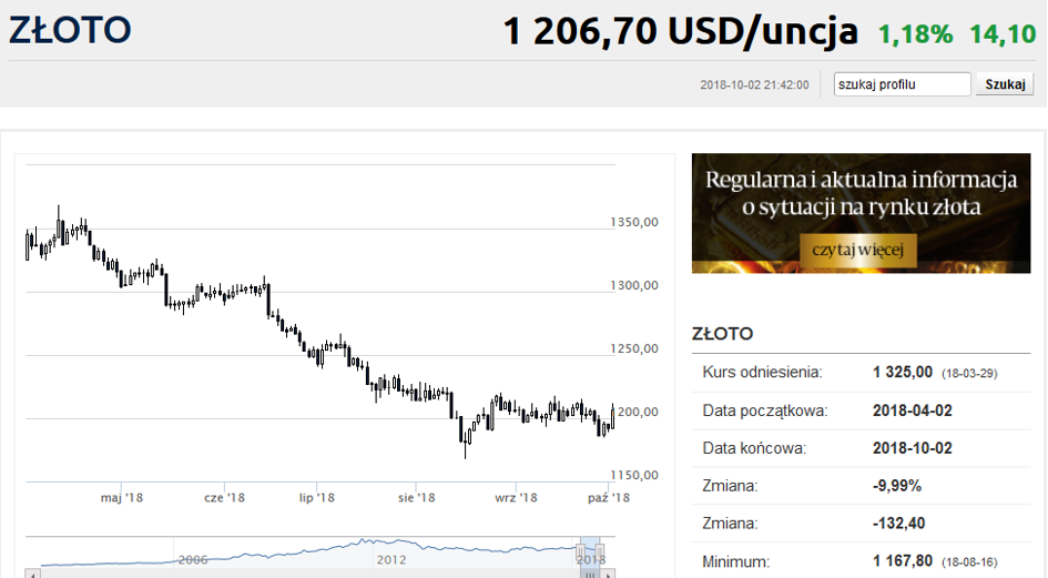 Metale szlachetne są w 2018 roku jedną z najsłabiej spisujących się klas aktywów (rzecz jasna za wyjątkiem walut rynków wschodzących i sWIGu). Od początku roku dolarowe notowania złota obniżyły się o 7,3%, a srebra aż o 14,2%. Platyna jest obecnie o 11,2% tańsza, niż była w sylwestra 2017 roku, po drodze zaliczając 10-letnie minimum.