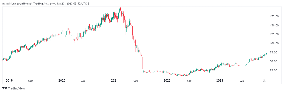 Notowaniom spółki wciąż daleko jednak do rekordowych poziomów, widocznych na wykresie na początku 2021 roku, kiedy kurs akcji New Oriental Education zbliżał się do 200 dol.